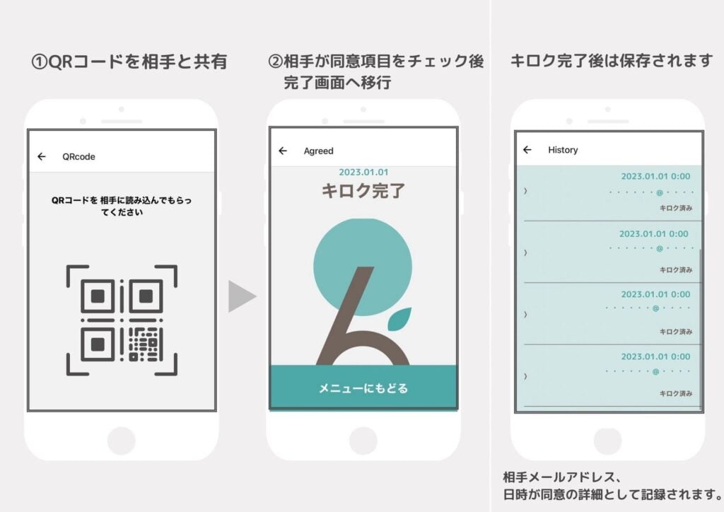 そこで法改正に伴い性行為の同意をお持ちの端末からWEB上で行える〈性的同意サービス「キロク」〉を開発いたしました。